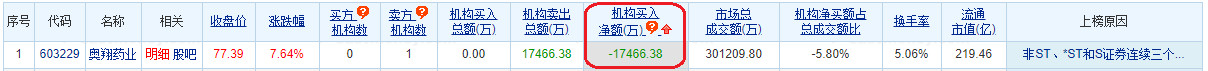 龙虎榜数据显示,卖出奥翔药业金额最大的前五名中,有1家机构专用席位。经统计,今日奥翔药业的机构席位净卖出金额为17466.38万元。