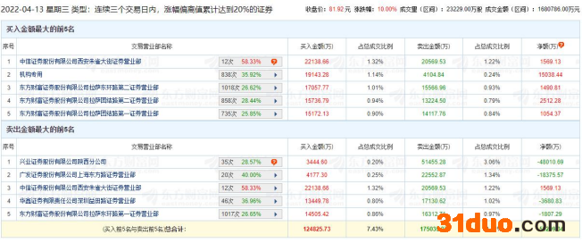 中国经济网北京4月13日讯 九安医疗(002432.SZ)今日涨停,截至收盘报81.92元,涨幅10.00%。