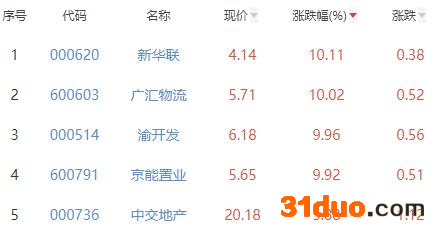 其中,新华联、广汇物流、渝开发、京能置业、中交地产位列板块涨幅前五位,涨幅分别为10.11%、10.02%、9.96%、9.92%、5.88%。