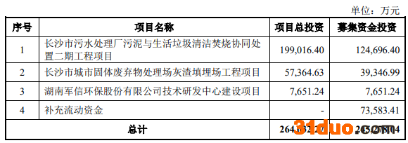 军信股份本次发行募集资金总额为23.79亿元,募集资金净额为22.65亿元。该公司最终募集资金净额比原计划少1.88亿元。军信股份于2022年4月8日披露的招股说明书显示,公司拟募集资金24.53亿元,分别用于长沙市污水处理厂污泥与生活垃圾清洁焚烧协同处置二期工程项目、长沙市城市固体废弃物处理场灰渣填埋场工程项目、湖南军信环保股份有限公司技术研发中心建设项目、补充流动资金。