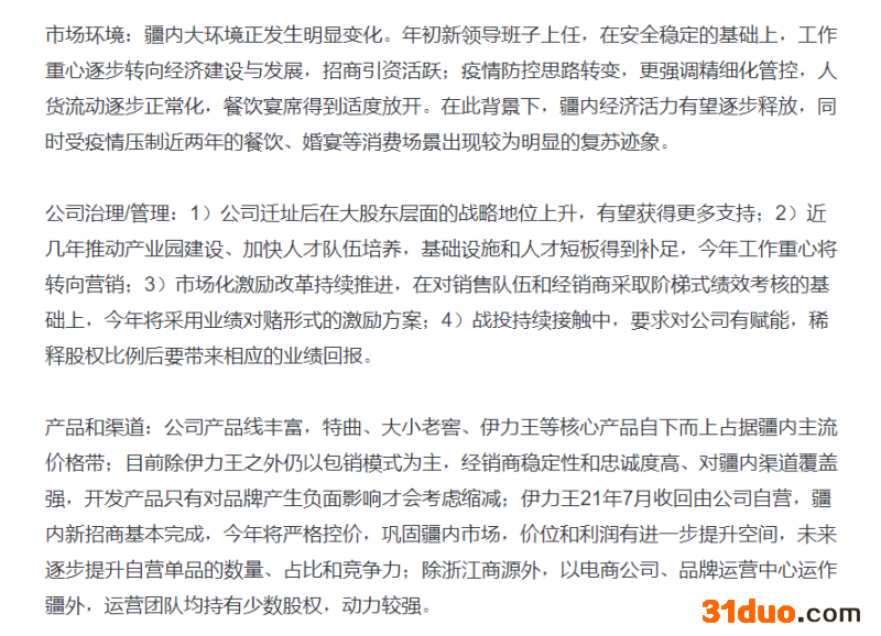 国海证券近期研报指出,根据调研反馈,2021年疆内白酒市场规模约40亿,伊力特市占率高于40%;公司旗下拥有十亿级单品“伊力老窖”系列,同时在次高端和中高端还拥有伊力王酒、特曲等知名单品,产品自上而下完成疆内市场全覆盖。