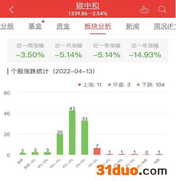 中国经济网北京4月13日讯 今日,碳中和板块整体跌幅2.54%,其中11只股票上涨,3只股票平盘,104只股票下跌。
