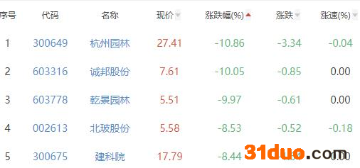 杭州园林、诚邦股份、乾景园林、北玻股份、建科院位列涨幅榜后五位,涨幅分别为-10.86%、-10.05%、-9.97%、-8.53%和-8.44%。