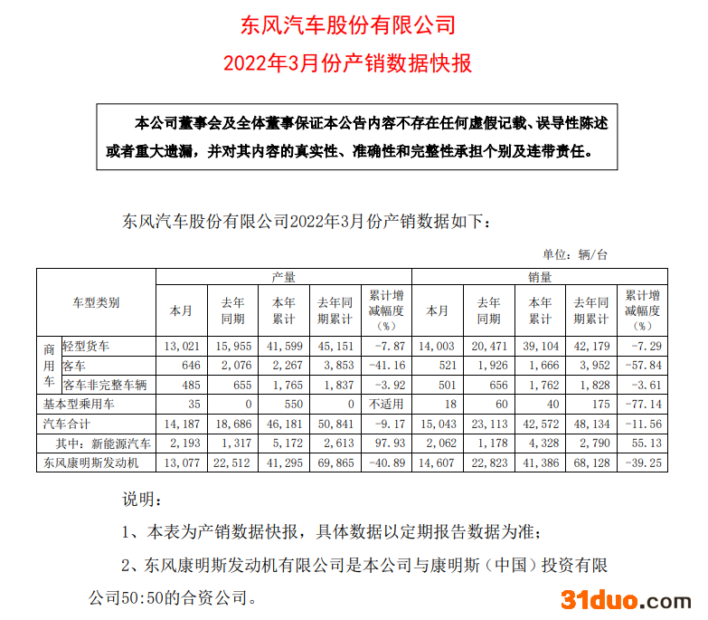 中国网汽车4月13日讯 记者日前获悉,东风汽车于近日发布了最新的产销数据,据统计,东风汽车产量合计14187辆,相比去年同期的18686辆,同比下降了24.08%,销量合计15043辆,相比去年同期的23113辆,同比下降了34.92%。今年1-3月,累计产量为46181辆,同比下降9.17%,累计销量为42572辆,同比下降11.56%。