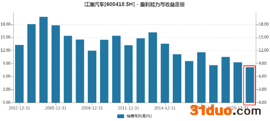 商用车产销量的减少,导致江淮汽车成熟产线的规模效应趋弱,拖累公司整体盈利能力。数据显示,2021年,江淮汽车毛利率仅8.16%,创下近20年以来公司的新低。