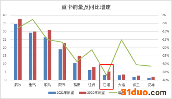 在商用车业务中,江淮卡车销售收入降至188.5亿元,为公司2015年以来的最低水平。其中,重卡销量同比大降36.9%,也成为2021年国内主要重卡生产厂商增速最低的车企。