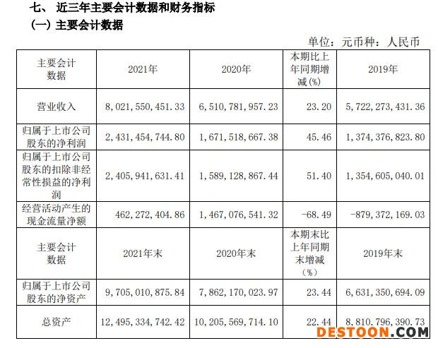 年报显示,2021年,片仔癀实现营业收入80.22亿元,同比增长23.20%;归属于上市公司股东的净利润24.31亿元,同比增长45.46%;归属于上市公司股东的扣除非经常性损益的净利润24.06亿元,同比增长51.40%;经营活动产生的现金流量净额4.62亿元,同比下降68.49%;基本每股收益4.03元,拟每10股派发现金股利12.10元(含税)。