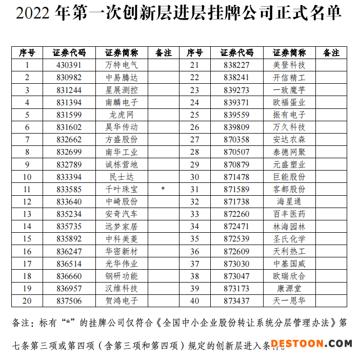 全国股转公司日前发布的2022年第一次创新层进层决定的公告显示,40家新三板挂牌公司将于4月18日正式进入新三板创新层。