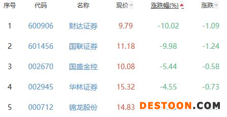 财达证券、国联证券、国盛金控、华林证券、锦龙股份位列涨幅榜后五位,涨幅分别为-10.02%、-9.98%、-5.44%、-4.55%、-3.83%。