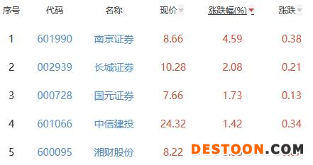 其中,南京证券、长城证券、国元证券、中信建投、湘财股份位列板块涨幅前五位,涨幅分别为4.59%、2.08%、1.73%、1.42%、0.86%。