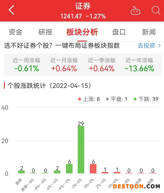 中国经济网北京4月15日讯 今日,证券板块整体跌幅1.27%,其中8只股票上涨,1只股票平盘,39只股票下跌。