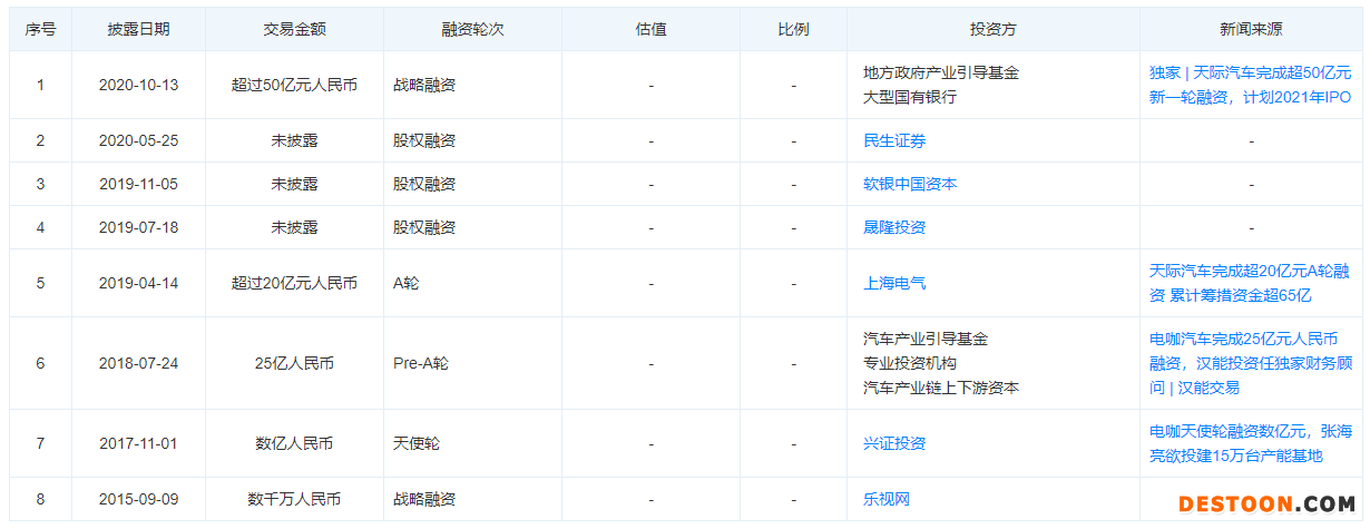 2019年4月,天际汽车完成超过20亿人民币的A轮融资,资金主要用于工厂及销售渠道的建设。其最后一笔公开融资信息是在2020年10月,融资总额超过50亿元,由地方政府产业引导基金和大型国有银行领投。