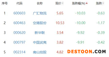 广汇物流、空港股份、新华联、中国武夷、南山控股位列涨幅榜后五位,涨幅分别为-10.03%、-10.00%、-9.92%、-9.91%、-7.13%。