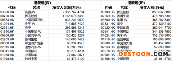 美团-W(03690.HK)、腾讯控股(00700.HK)、快手-W(01024.HK)为代表的科技股维持大幅流入,其流入金额分别为283亿元、201亿元、104亿元。