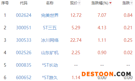 其中,完美世界、ST三五、冰川网络、山东矿机和*ST游久位列板块涨幅榜前五位,涨幅分别为7.07%、4.13%、1.11%、0.90%和0.00%。