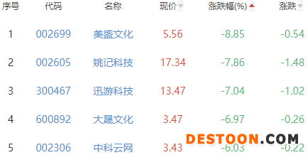 美盛文化、姚记科技、迅游科技、大晟文化和中科云网位列板块涨幅榜后五位,涨幅分别为-8.85%、-7.86%、-7.04%、-6.97%和-6.03%。