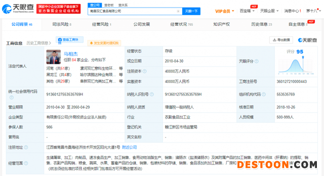 据天眼查App显示,南昌双汇食品有限公司成立于2010年4月,法定代表人马相杰,注册资本4亿人民币,经营范围含生猪屠宰、加工;肉制品、速冻食品生产、加工销售等,由湖北武汉双汇食品有限公司全资控股。食品安全抽检信息显示,该公司所生产的一款“里脊肉”曾因氧氟沙星、磺胺类(总量)超标被判定为不合格。