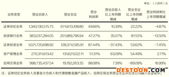 主营业务分业务来看,东北证券证券经纪业务实现营业收入13.40亿元,比上年同期增长10.39%,营业利润率49.66%,比上年同期减少4.87个百分点;投资银行业务实现营业收入3.83亿元,比上年同期增长35.07%,营业利润率47.27%,比上年同期减少13.50个百分点;证券投资业务实现营业收入10.22亿元,比上年同期减少37.43%,营业利润率87.44%,比上年同期减少7.45个百分点;资产管理业务实现营业收入2.70亿元,比上年同期增长63.09%,营业利润率51.31%,比上年同期增长2.71个百分点;信用交易业务实现营业收入9.99亿元,比上年同期增长7.39%,营业利润率98.08%,比上年同期增长16.99个百分点。