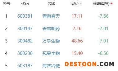 青海春天、香雪制药、万孚生物、冠昊生物、海容冷链位列涨幅榜后五位,涨幅分别为-7.66%、-7.01%、-7.01%、-6.50%、-5.37%。