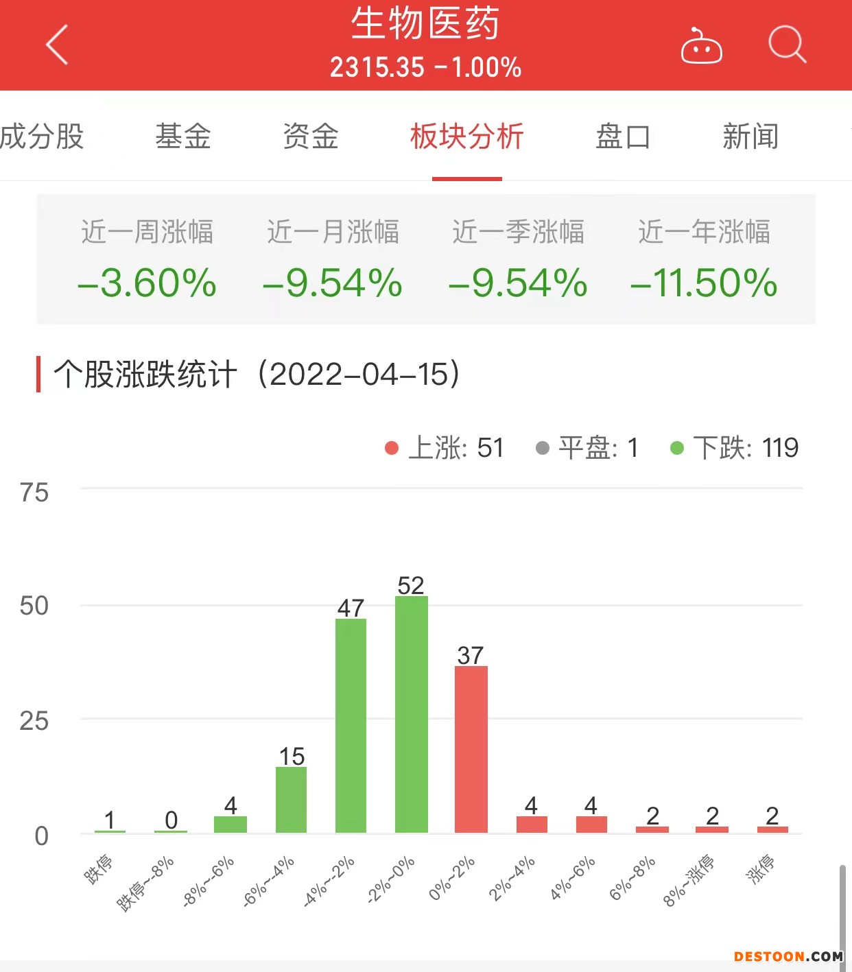 中国经济网北京4月15日讯 今日,生物医药板块整体跌幅1.00%,其中51只股票上涨,1只股票平盘,119只股票下跌。