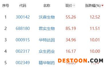 其中,沃森生物、君实生物、华特达因、众生药业、精华制药位列板块涨幅前五位,涨幅分别为12.52%、11.51%、10.01%、10.00%、7.54%。