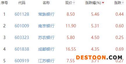 其中,常熟银行、南京银行、苏农银行、成都银行和江苏银行位列板块涨幅榜前五位,涨幅分别为5.46%、5.31%、4.50%、4.35%和3.71%。