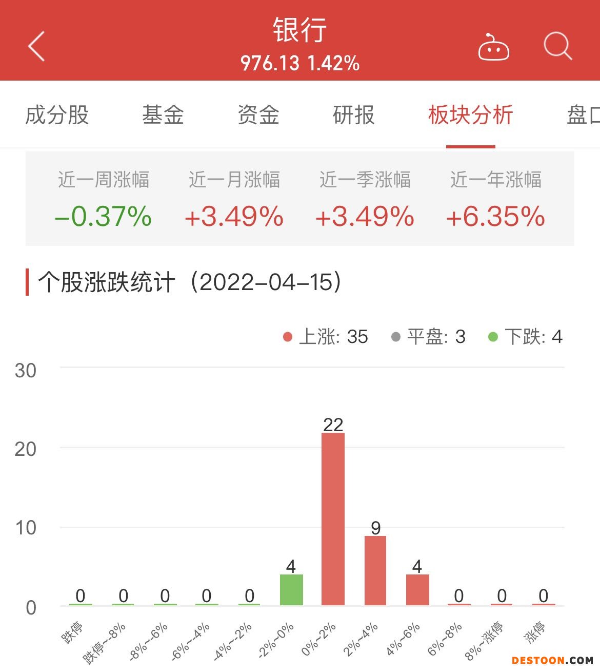 中国经济网北京4月15日讯 今日,银行板块整体涨幅1.42%,其中35只股票上涨,3只股票平盘,4只股票下跌。