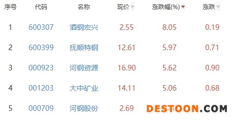 其中,酒钢宏兴、抚顺特钢、河钢资源、大中矿业、河钢股份位列板块涨幅前五位,涨幅分别为8.05%、5.97%、5.62%、5.06%、3.86%。