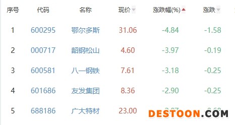 鄂尔多斯、韶钢松山、八一钢铁、友发集团、广大特材位列涨幅榜后五位,涨幅分别为-4.84%、-3.97%、-3.18%、-2.90%、-2.87%。