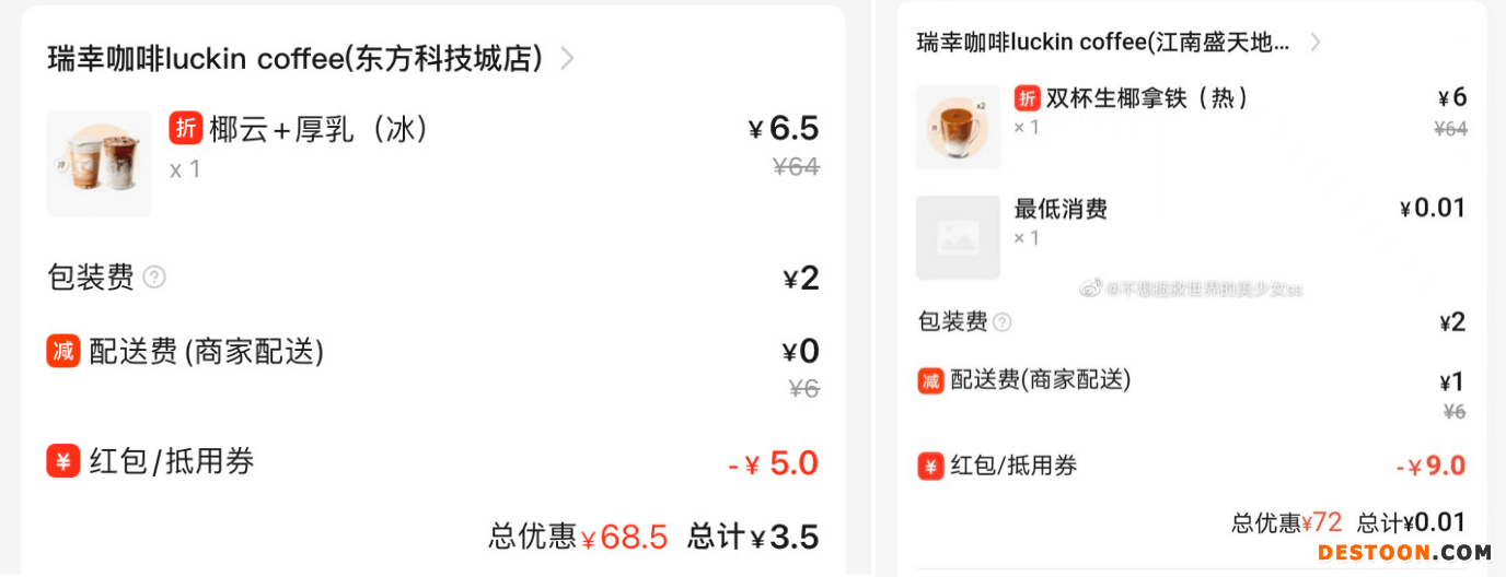 多名消费者在社交媒体晒出自己的消费记录,瑞幸咖啡“椰云+厚乳”的套餐,现价为6.5元,在使用饿了么红包的情况下,仅用3.5元便可购买;甚至有消费者仅用1分钱便买到了原价64元的“双杯生椰拿铁“套餐。
