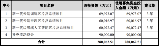 寒武纪募集资金总额25.82亿元,扣除发行费用后,募集资金净额为24.98亿元。寒武纪最终募集资金净额较原计划少3.03亿元。寒武纪于2020年7月14日披露的招股说明书显示,公司拟募集资金28.01亿元,分别用于新一代云端训练芯片及系统项目、新一代云端推理芯片及系统项目、新一代边缘端人工智能芯片及系统项目、补充流动资金。