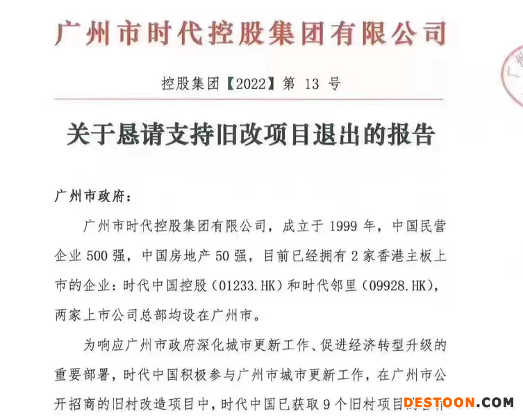 4月16日,一份广州时代控股集团有限公司(以下简称时代中国)《关于恳请支持旧改项目退出的报告》(以下简称《报告》)在业内流传,这份《报告》的对象是广州市政府。