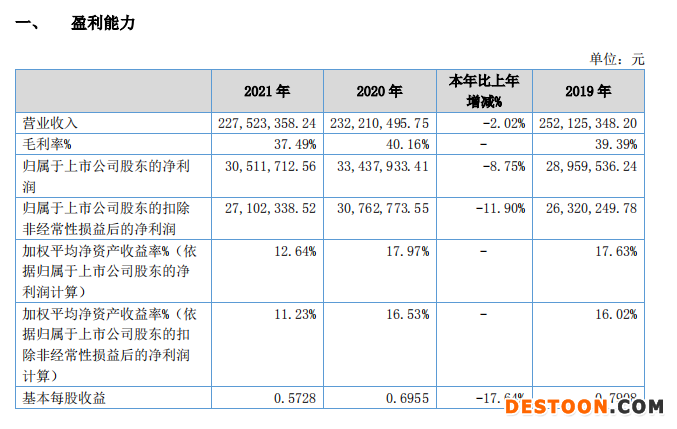 年报显示,2021年,常辅股份的营业收入和扣非后归母净利润分别同比下滑2.02%和11.90%。对于净利润下滑,且下滑幅度大于营收降幅的原因,常辅股份表示,主要是2021年度受原材料涨价因素影响,公司产品销售毛利率下降,以及公司在2020年度享受了国家在新冠疫情期间出台的社保费用减免政策。