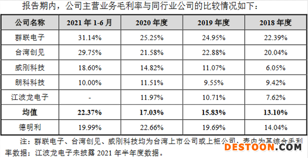 2018年、2019年、2020年和2021年1-6月,德明利综合毛利率分别为14.04%、19.69%、22.66%和19.99%,主营业务毛利率分别为14.04%、19.69%、22.66%和19.99%。