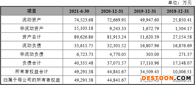2018年末、2019年末、2020年末和2021年1-6月末,德明利资产总计分别为27,154.58万元、51,620.39万元、81,913.24万元和89,626.86万元,负债合计分别为17,148.07万元、17,110.96万元、37,071.57万元和40,335.48万元。