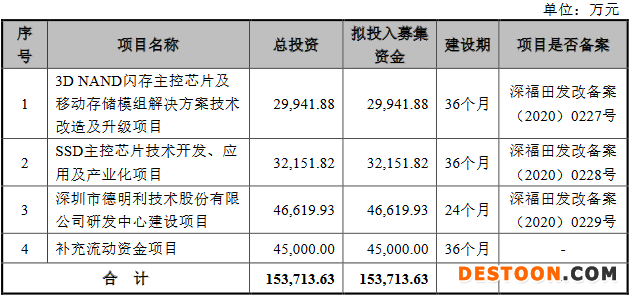 德明利本次公开发行新股数量不超过2,000万股,占发行后总股本的比例不低于25%。该公司拟募集资金153,713.63万元,其中,29,941.88万元拟用于3D NAND闪存主控芯片及移动存储模组解决方案技术改造及升级项目,32,151.82万元拟用于SSD主控芯片技术开发、应用及产业化项目,46,619.93万元拟用于深圳市德明利技术股份有限公司研发中心建设项目,45,000.00万元拟用于补充流动资金项目。