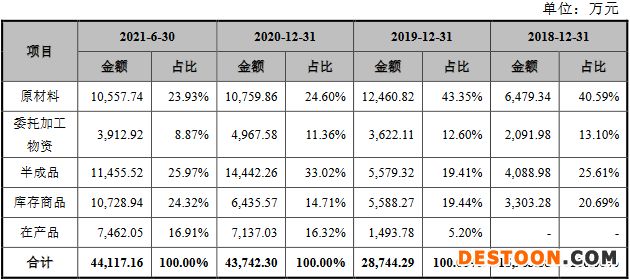 2018年末、2019年末、2020年末和2021年6月末,德明利存货中,原材料账面价值分别为6,479.34万元、12,460.82万元、10,759.86万元和10,557.74万元,占比分别为40.59%、43.35%、24.60%和23.93%;半成品账面价值分别为4,088.98万元、5,579.32万元、14,442.26万元和11,455.52万元,占比分别为25.61%、19.41%、33.02%和25.97%;库存商品账面价值分别为3,303.28万元、5,588.27万元、6,435.57万元和10,728.94万元,占比分别为20.69%、19.44%、14.71%和24.32%;在产品账面价值分别为0元、1,493.78万元、7,137.03万元和7,462.05万元,占比分别为0、5.20%、16.32%和16.91%。