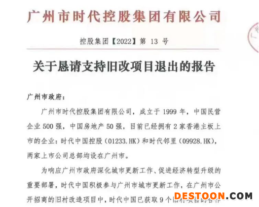 4月16日,一份广州时代控股集团有限公司(以下简称时代中国)《关于恳请支持旧改项目退出的报告》(以下简称《报告》)在业内流传,这份《报告》的对象是广州市政府。