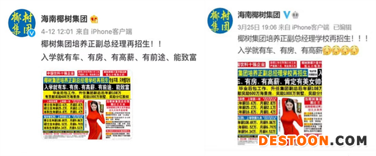 去年和今年的椰树招聘广告。来源:椰树官微和网络截图