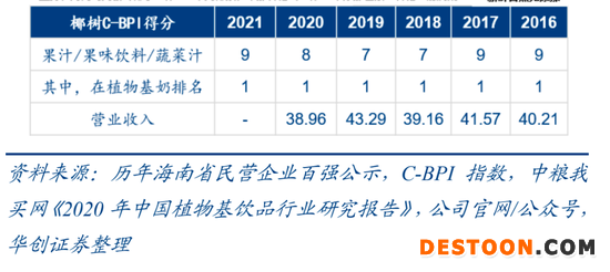 在市场占比上,椰树内部文章《魂系椰树大展宏图》中引用的数据显示,1999年,椰树旗下果汁产品在果汁饮料市场的占有率达到75%,在植物蛋白饮料的市场占有率为50.3%。