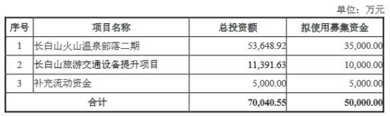 本次非公开发行募集资金总额不超过50,000.00万元,扣除发行费用后的募集资金净额拟用于长白山火山温泉部落二期、长白山旅游交通设备提升项目、补充流动资金。