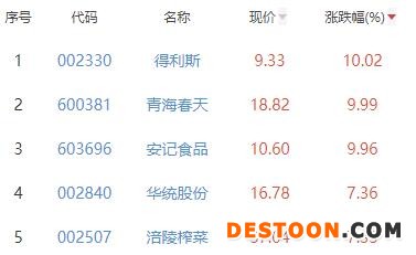 其中,得利斯、青海春天、安记食品、华统股份、涪陵榨菜位列板块涨幅前五位,涨幅分别为10.02%、9.99%、9.96%、7.36%、7.33%。