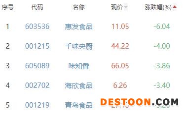 惠发食品、千味央厨、味知香、海欣食品、青岛食品位列涨幅榜后五位,涨幅分别为-6.04%、-4.00%、-3.86%、-3.40%、-3.25%。