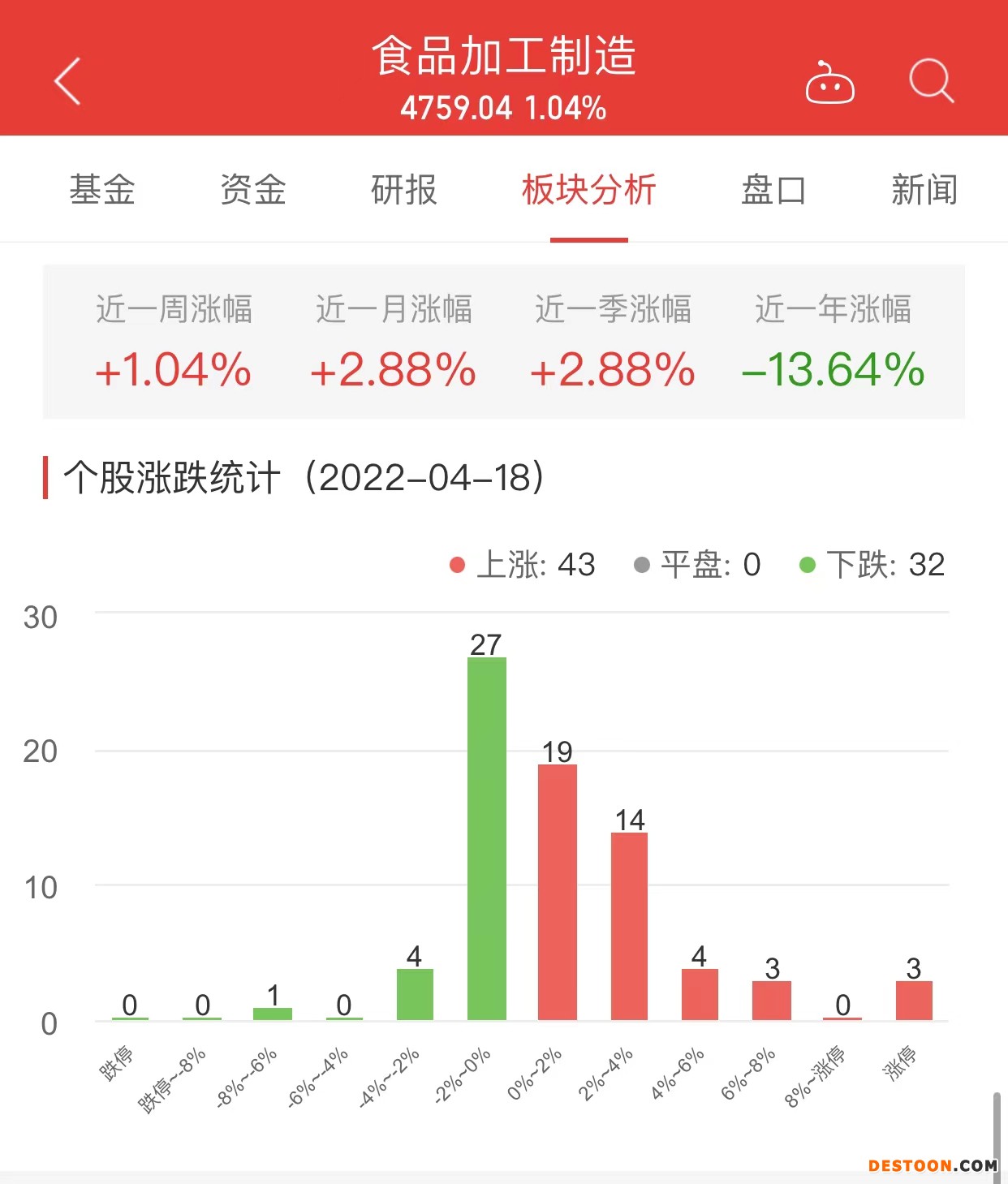 中国经济网北京4月18日讯 今日,食品加工制造板块整体涨幅1.04%,其中43只股票上涨,0只股票平盘,32只股票下跌。