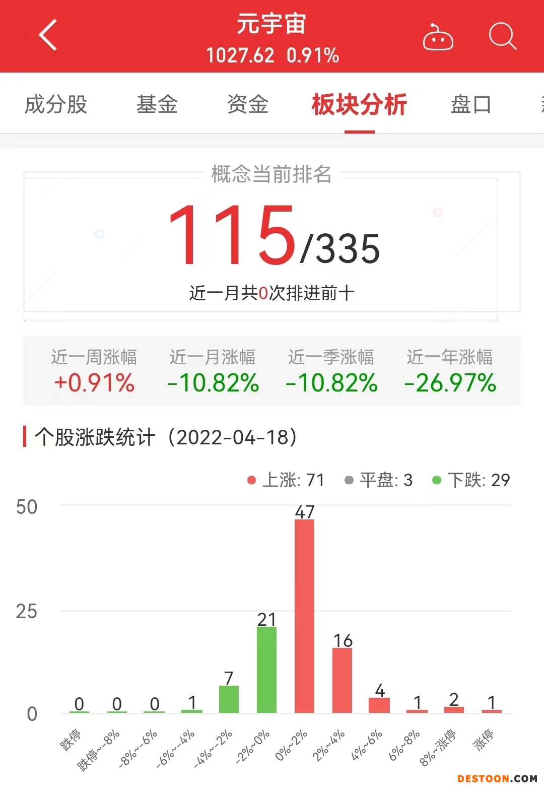 中国经济网北京4月18日讯 今日,元宇宙板块整体涨幅0.91%,其中71只股票上涨,3只股票平盘,29只股票下跌。