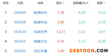 数源科技、新湖中宝、完美世界、凯撒文化、世纪华通位列板块涨幅榜后五位,涨幅分别为-4.28%、-3.35%、-3.22%、-3.13%、-3.05%。