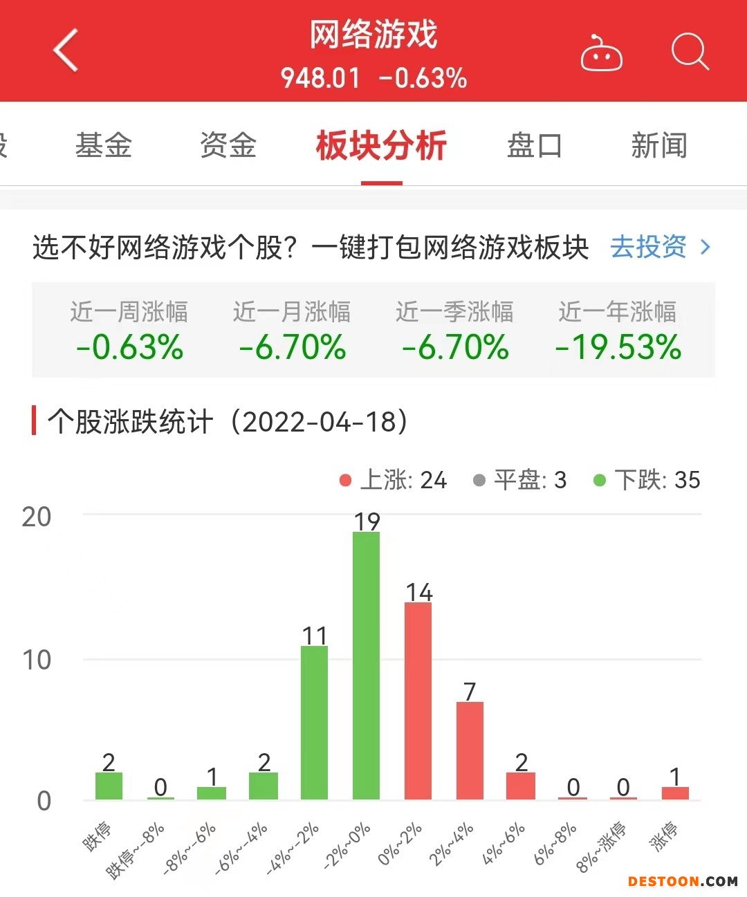 中国经济网北京4月18日讯 今日,网络游戏板块整体涨幅-0.63%,其中24只股票上涨,3只股票平盘,35只股票下跌。
