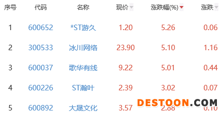 其中,*ST游久、冰川网络、歌华有线、ST瀚叶、大晟文化位列板块涨幅榜前五位,涨幅分别为5.26%、5.10%、5.01%、3.02%、2.88%。