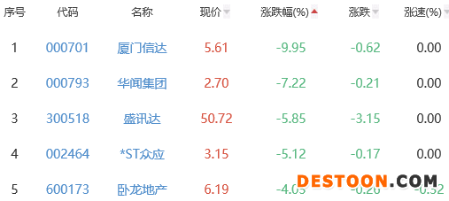 厦门信达、华闻集团、盛讯达、*ST众应、卧龙地产位列板块涨幅榜后五位,涨幅分别为-9.95%、-7.22%、-5.85%、-5.12%、-4.03%。