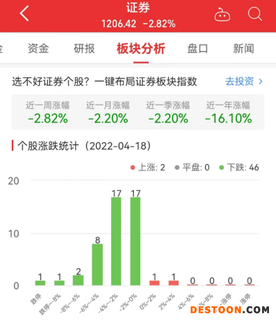 中国经济网北京4月18日讯 今日,证券板块整体跌幅2.82%,其中2只股票上涨,0只股票平盘,46只股票下跌。